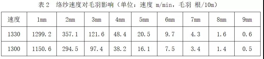 品種:陽離子滌綸T/R 65/35 18.4tex,試驗(yàn)條件:YG172A紗線毛羽測試儀,測試速度:30m/min,測試長度:60m,絡(luò)筒速度:1300m/min2.2.6.1 做好優(yōu)化工藝控制自絡(luò)毛羽增長的試驗(yàn)(1)優(yōu)選絡(luò)筒速度和絡(luò)紗張力,自動絡(luò)筒機(jī)絡(luò)紗張力、絡(luò)紗速度對毛羽有很大的影響。絡(luò)紗速度和絡(luò)紗張力在工藝調(diào)整時(shí)應(yīng)看做一個整體進(jìn)行,如果僅考慮一個工藝參數(shù)會適得其反,具體優(yōu)選時(shí)相互結(jié)合,可以做到高速運(yùn)行毛羽增長幅度不大的效果。絡(luò)紗速度對毛羽影響見表2。