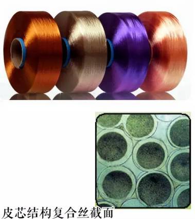這種復(fù)合絲由兩種不同成份的聚合物構(gòu)成,一種成份分布在纖維的中心,形成芯部,另一種成份分布在纖維的皮層,形成皮芯結(jié)構(gòu),通常以滌綸為芯,錦綸為皮層。由于錦綸在皮層,所以有較好的吸濕性和染色性,同時(shí)由于彈性模量較高的滌綸在芯層做支撐結(jié)構(gòu),因此織成的面料具有較好的抗皺性能。想要織造出易染色、手感挺括的仿真絲織物,可以優(yōu)先考慮皮芯結(jié)構(gòu)復(fù)合絲。