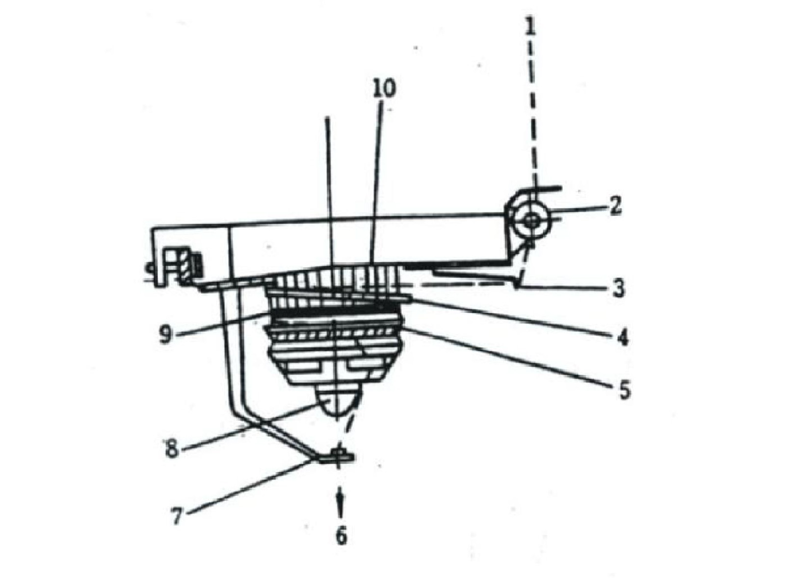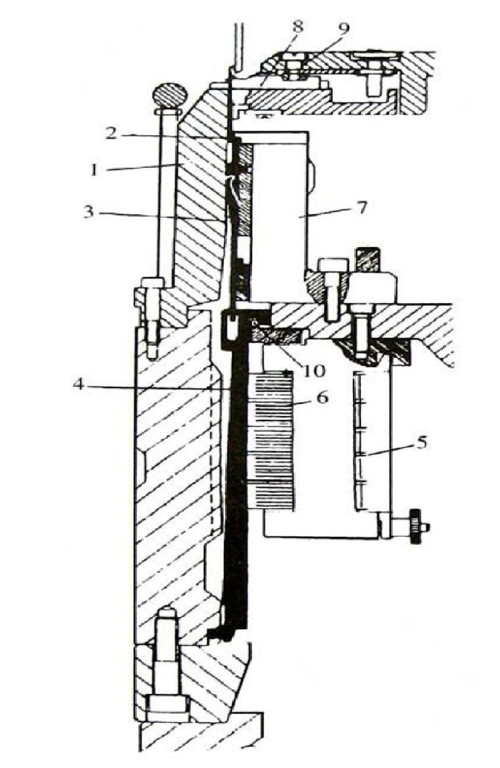 落地紗架上的紗筒經(jīng)一系列導(dǎo)紗鉤(改變方向)——半儲(chǔ)存式給紗裝置——編織區(qū)域。其中,半儲(chǔ)存式給紗裝置為消極式結(jié)紗裝置(如圖4-1),紗線1經(jīng)張力裝置2、斷紗自停探桿3(斷紗時(shí)指示燈8閃亮),切向卷繞在儲(chǔ)紗筒10上。儲(chǔ)紗筒由內(nèi)裝的微型電動(dòng)機(jī)(老式)或條帶(新式)驅(qū)動(dòng)。當(dāng)傾斜配置的圓環(huán)4處于最高位置時(shí),它使控制電動(dòng)機(jī)的微型開關(guān)接通,或使控制條帶與儲(chǔ)紗筒接觸的電磁離合器通電,從而電動(dòng)機(jī)(或條帶)驅(qū)動(dòng)儲(chǔ)紗筒回轉(zhuǎn)進(jìn)行卷繞。由于圓環(huán)4的傾斜,卷繞過程中紗線被推向圓環(huán)的最低位置。當(dāng)儲(chǔ)紗筒上的卷繞紗圖數(shù)達(dá)最大時(shí)(約4-5圈),圓環(huán)4使電動(dòng)機(jī)開關(guān)斷開或電磁離合器斷電,因此,儲(chǔ)紗筒停止卷繞。