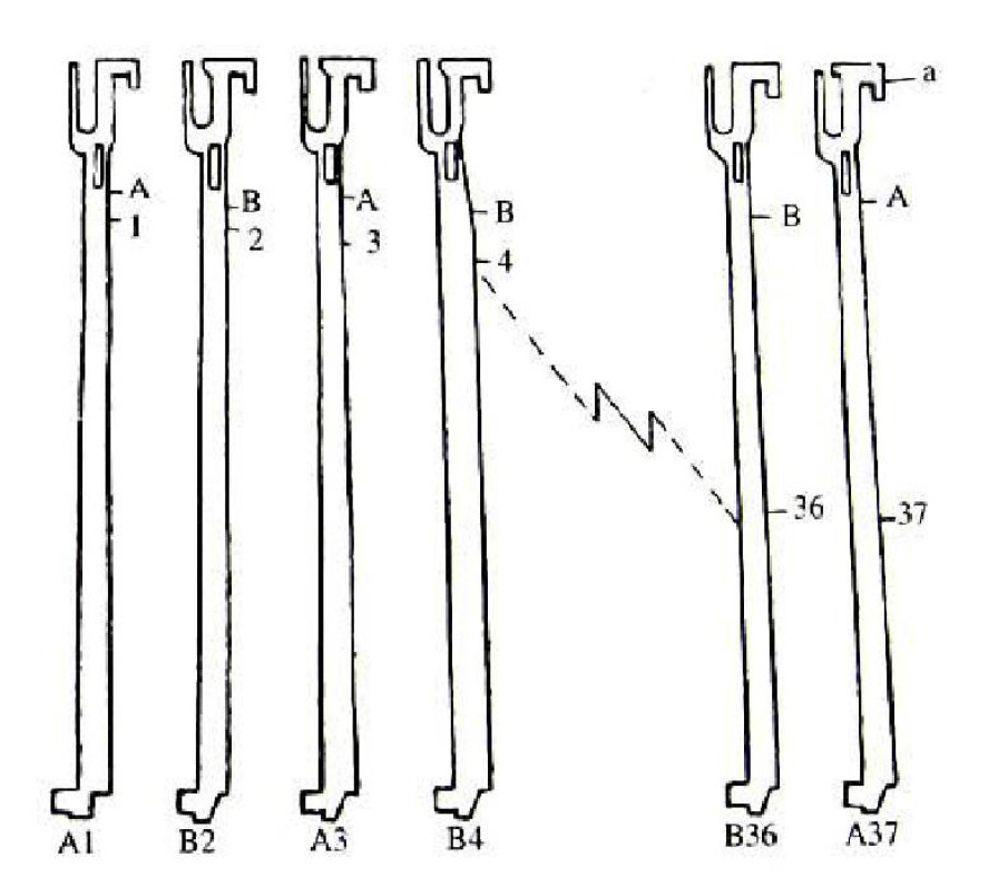 撥片式選針機(jī)構(gòu)由發(fā)出選針花紋信息的選針元件投片、傳遞花紋信息的機(jī)件提花片以及執(zhí)行花紋信息的工作機(jī)件織針組成。一般來說,它屬二級(jí)選針機(jī)構(gòu),即編織與不編織。其工作原理是,花紋信息—撥片—提花片——織針編織或不編織。
