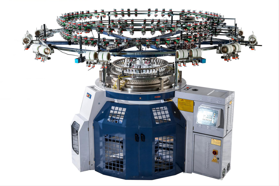Hanma漢馬毛圈針織機(jī)是用以編織毛圈組織針織物的針織機(jī)。在用地紗編織地組織的同時,喂入毛圈紗。毛圈紗與地紗一起參加編織。針織機(jī)的沉降片或鉤針將毛圈紗的線圈沉降弧拉長,形成毛圈。毛圈織物適于作服裝、家庭用品和某些工業(yè)材料。毛圈針織機(jī)的種類較多,有緯編機(jī)型,也有經(jīng)編機(jī)型。比較普遍應(yīng)用的是單針床多三角機(jī)機(jī)型。它通過的導(dǎo)紗器,將地紗和毛圈紗分別墊放在沉降片的片顎和片鼻上,并同時處于舌針的針口內(nèi),如上頁圖所示。編織后,片顎上地紗形成緯編平針組織的地組織,片鼻上毛圈紗在與地紗一起成圈的同時,在織物反面形成拉長的沉降弧。選用片顎與片鼻不同高度差的沉降片,可編織出不同毛圈長度的針織物。在這種毛圈針織機(jī)上,還可安裝提花裝置,控制沉降片進(jìn)出,使毛圈紗有時在沉降片片顎上成圈,有時在片鼻上成圈,可編織花色毛圈針織物。毛圈針織機(jī)也有雙針床圓緯機(jī)機(jī)型,一只針床上的舌針同時鉤住地紗和毛圈紗編織成圈,另一針床上的無舌鉤針僅鉤住毛圈紗,拉長毛圈紗線圈的沉降弧,形成毛圈針織物,如上頁圖b所示。用改變無舌鉤針與舌針的相對位置,便可編織不同長度的毛圈。