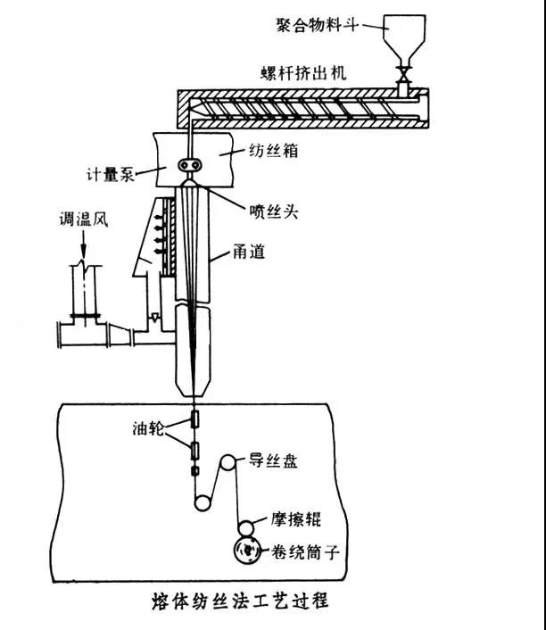 熔體紡絲方法的主要特點(diǎn)是紡絲速度高(1000~7000m/min),無需溶劑和沉淀劑及其回收、循環(huán)系統(tǒng),設(shè)備簡單,工藝流程短,是一種經(jīng)濟(jì)、方便和效率高的成形方法。但噴絲頭孔數(shù)相對較少。