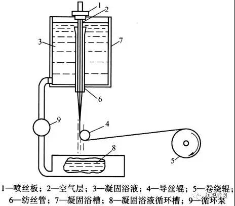 干濕法紡絲是,紡絲溶液從噴絲頭壓出后,先經(jīng)過一段氣體(一般是空氣)層(氣隙),然后進(jìn)入凝固浴,因此也有人把這種方法稱為氣隙紡絲。從凝固浴中導(dǎo)出的初生纖維的后處理過程,與普通濕法紡絲相同。