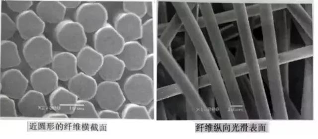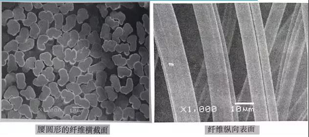 普通粘膠纖維復(fù)雜成型過程的不均勻性會(huì)使常規(guī)粘膠纖維的橫截面呈腰圓形或無規(guī)則狀,內(nèi)部有孔洞,縱向有無規(guī)則溝槽。粘膠具有優(yōu)良的吸濕性、易染性,但是其模量、強(qiáng)度較低,尤其是濕強(qiáng)度低。