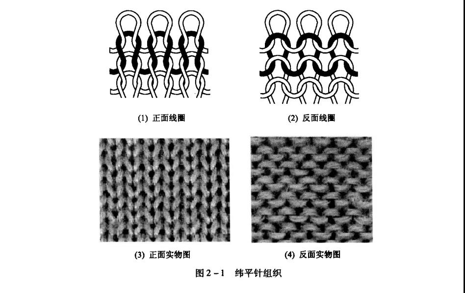 緯平針組織是由連續(xù)的同一種單元線圈向一個(gè)方向依次串套而成。緯平針組織的兩面具有不同的幾何形態(tài),正面線圈上的圈柱與線圈縱行配置成一定角度,紗線上的結(jié)頭、棉結(jié)雜質(zhì)容易被舊線圈所阻擋而停留在針織物的反面,因而正面一般較為光潔平整。反面的圈弧與線圈橫列同向配置,對(duì)光線有較大的漫反射作用,因而較為陰暗。