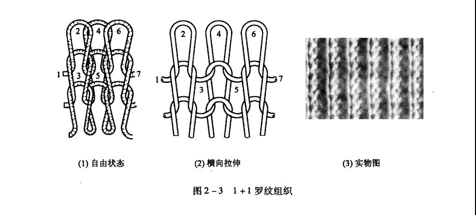 羅紋組織縱向和橫向都有較好的彈性和延伸性,且橫向延伸性大于縱向。羅紋組織只能逆編織方向脫散。在正反面線圈縱行數(shù)相同的羅紋組織中,如1+1羅紋,由于造成卷邊的力彼此平衡,因而并不出現(xiàn)卷邊現(xiàn)象。常用于生產(chǎn)貼身彈力內(nèi)衣、休閑服裝、游泳衣褲面料以及領(lǐng)口、褲口、袖口等彈性部位。