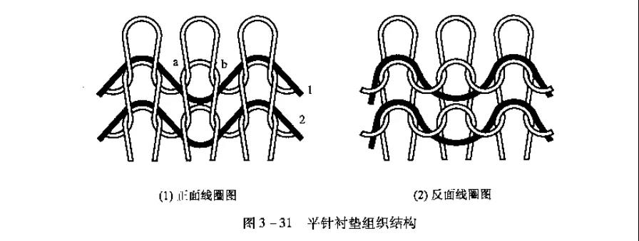 襯墊組織是以一根或幾根襯墊紗線按一定比例在織物的某些線圈上形成不封閉的懸弧,而在其余的線圈上呈浮線停留在織物反面。地紗編織襯墊組織的地組織,襯墊紗在地組織上按一定的規(guī)律編織成不封閉的懸弧,從而形成襯墊組織。