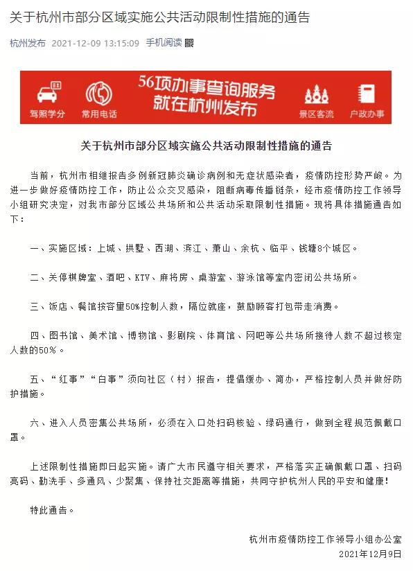 經(jīng)市疫情防控工作領(lǐng)導(dǎo)小組研究決定,對(duì)杭州市部分區(qū)域公共場(chǎng)所和公共活動(dòng)采取限制性措施。上城、拱墅、西湖、濱江、蕭山、余杭、臨平、錢塘8個(gè)城區(qū),關(guān)停棋牌室、酒吧、KTV、麻將房、桌游室、游泳館等室內(nèi)密閉公共場(chǎng)所等。