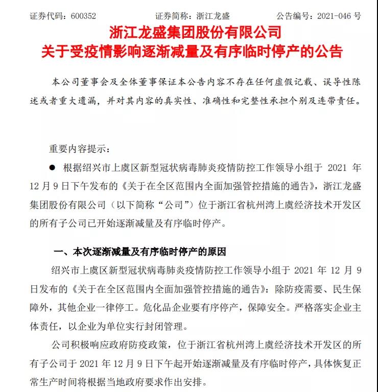 多個(gè)地區(qū)緊急叫停全區(qū)所有工業(yè)企業(yè),對(duì)于石化、?;瘜?duì)企業(yè)的開工做出限制,隨后浙江龍盛、皇馬科技、貝斯美等十幾家上市公司發(fā)布臨時(shí)停產(chǎn)公告,并預(yù)計(jì)將給企業(yè)的經(jīng)營(yíng)業(yè)績(jī)帶來不利影響。