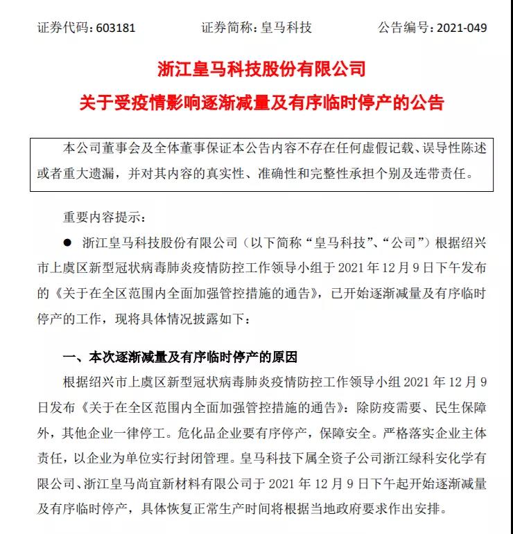 皇馬科技:公司下屬全資子公司浙江綠科安化學(xué)有限公司、浙江皇馬尚宜新材料有限公司于12月9日下午起開始逐漸減量及有序臨時(shí)停產(chǎn)。預(yù)計(jì)本次逐漸減量及有序臨時(shí)停產(chǎn)將延遲公司產(chǎn)品的生產(chǎn)和交付,預(yù)計(jì)會(huì)對(duì)公司本月經(jīng)營(yíng)業(yè)績(jī)產(chǎn)生不利影響。