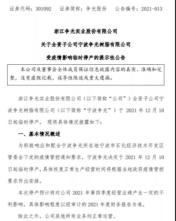 爭(zhēng)光股份:全資子公司寧波爭(zhēng)光樹脂有限公司于2021年12月10日起臨時(shí)停產(chǎn),具體恢復(fù)正常生產(chǎn)經(jīng)營(yíng)時(shí)間將根據(jù)當(dāng)?shù)卣咔楣芸匾笞鞒霭才拧?/span>