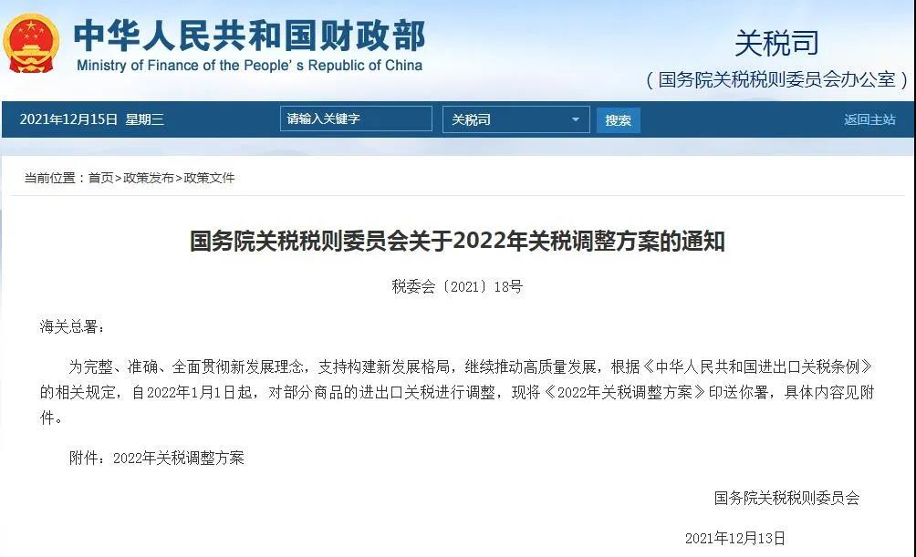 12月15日,國(guó)務(wù)院關(guān)稅稅則委員會(huì)發(fā)布2022年關(guān)稅調(diào)整方案,對(duì)部分商品的進(jìn)出口關(guān)稅進(jìn)行調(diào)整。相關(guān)方案,除另有規(guī)定外,自2022年1月1日起實(shí)施。