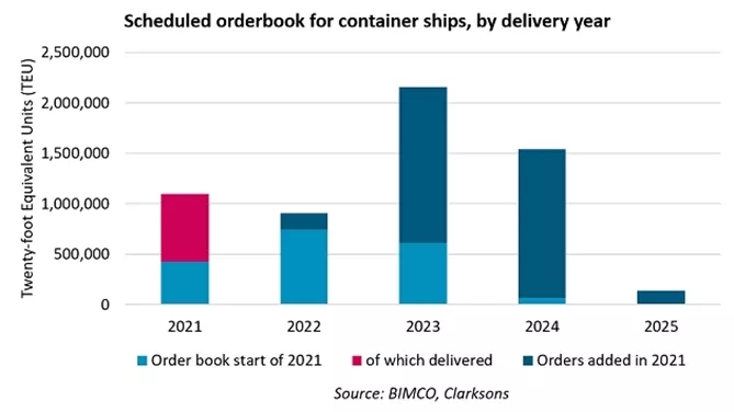 根據(jù)《希臘航運新聞》的報道,2021年迄今,已訂購運力中的相當于150萬TEU的集裝箱船將在2023年和2024年交付,預計不會打破2015年創(chuàng)下的166萬TEU紀錄。