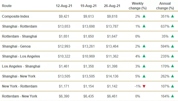 Drewry世界集裝箱指數(shù)顯示,截至8月26日當周,一個40英尺集裝箱在主要跨洋航線的加權平均運費上漲2.1%,達到9818美元的紀錄高位。
