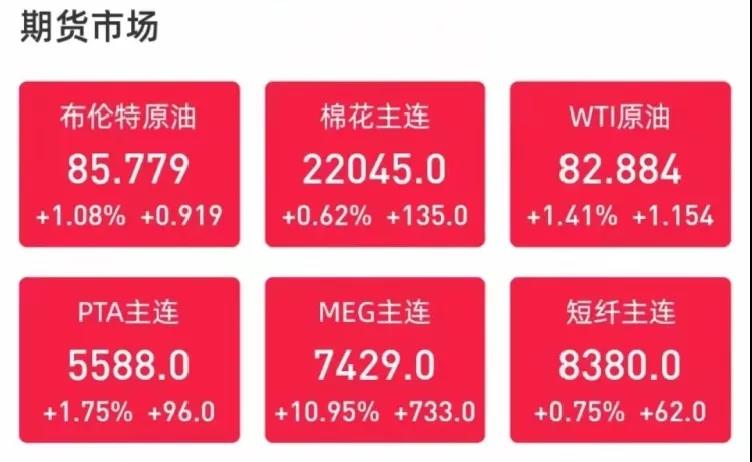 原料昨日又是火紅一片,受油價(jià)及減產(chǎn)影響,聚酯原料PTA大漲,乙二醇期貨主力合約漲停,漲幅10.99%,報(bào)7432元/噸,熔體成本突破7200,較9月份上漲1200元再次創(chuàng)下年內(nèi)新高。