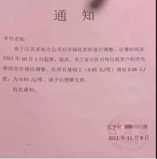 江蘇部分地區(qū)電價(jià)調(diào)整通知書: