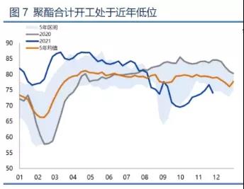 從分項來看,截至2021年12月2日,國內滌綸長絲開工負荷77.11%,環(huán)比-6.19%;滌綸短纖開工負荷67.02%,環(huán)比-1.31%;聚酯瓶片開工負荷維持78.46%不變。整體開工也處于近5年低位。